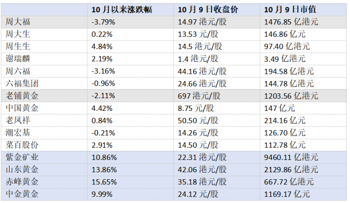 Wind數(shù)據(jù)顯示,以紫金礦業(yè)、山東黃金、赤峰黃金為代表的產(chǎn)業(yè)鏈上游板塊漲勢(shì)喜人;蛞虺杀旧蠞q帶來(lái)的門(mén)店端壓力,10月以來(lái),包括周大福、周大生、謝瑞麟、老鋪黃金在內(nèi)的黃金珠寶企業(yè)漲幅不大,甚至部分企業(yè)出現(xiàn)微跌。
