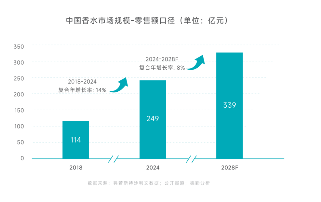 中國也有著同樣的高增長預(yù)期。德勤聯(lián)合穎通控股發(fā)布的《2025中國香水香氛行業(yè)白皮書》顯示,中國香水市場規(guī)模將從2024年的249億元增長到2028年的339億元,復(fù)合增長率達(dá)到8%。