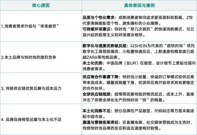 國際快時尚品牌從昔日的流量密碼走向衰退,核心原因在于其傳統(tǒng)的商業(yè)模式難以適應消費者需求的變化、激烈的市場競爭以及全球供應鏈格局的調(diào)整。下表簡要梳理了這些核心原因及其具體表現(xiàn):