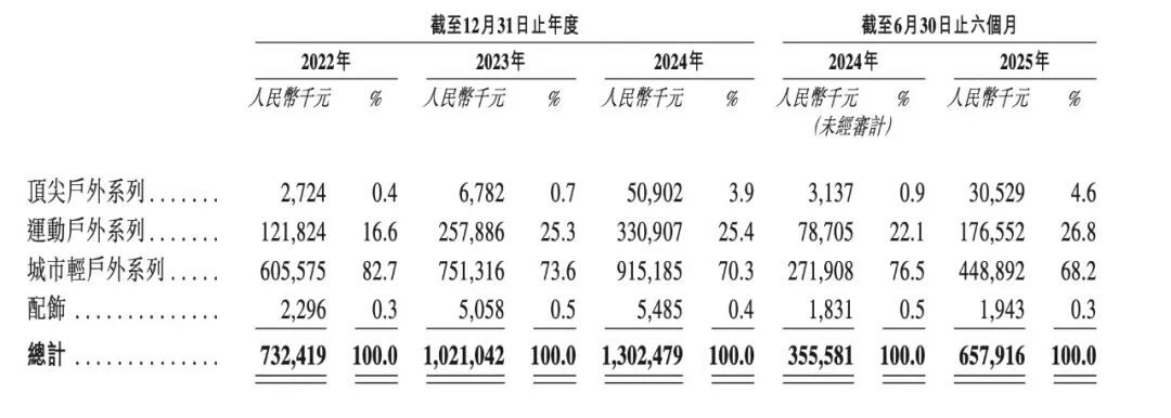 以坦博爾為例,2004年,坦博爾推出城市輕戶外系列,定價(jià)699元至1799元,這也是坦博爾目前最受歡迎的系列,2025年上半年,城市輕戶外系列的收入約4.49億元,占收入比重達(dá)68.2%。