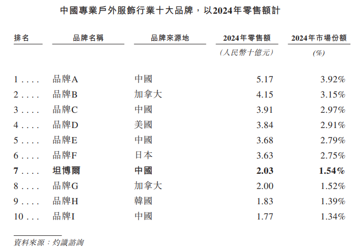 灼識咨詢資料顯示,于2024年零售額計,坦博爾是中國第四大本土專業(yè)戶外服飾品牌。結(jié)合公開資料,上榜的應(yīng)該還有波司登、凱樂石、伯希和等中國品牌。
