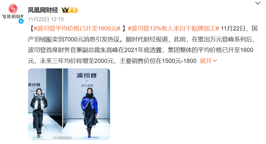 2023年冬天,#波司登均價突破1600元#的話題沖上微博熱搜,讓越來越多人們注意到這個老牌羽絨服巨頭的高端化轉(zhuǎn)型。彼時,波司登最高端的產(chǎn)品價格已經(jīng)達(dá)到上萬元一件。
