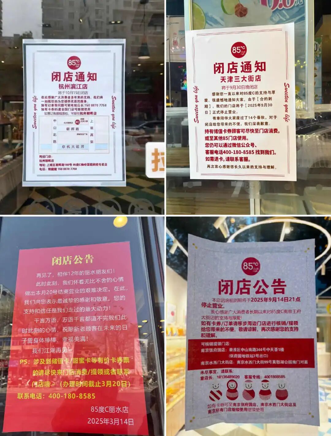在杭州,開了十多年的85度C慶春店已人去樓空,門店招牌被撤下,店內(nèi)桌椅也被搬運(yùn)一空,門口玻璃上貼著閉店公告,顯示該店已于9月18日停止?fàn)I業(yè)。此外,85度C位于杭州的江城路店、富陽玉長城店也都在近期相繼關(guān)閉,濱江店也貼出公告,宣布將于本月15日閉店。