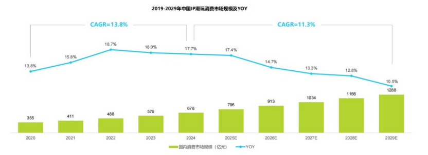 另一方面,年輕人重視的情緒消費(fèi)、體驗(yàn)消費(fèi),仍有大增量!吨袊蓖媾c動(dòng)漫產(chǎn)業(yè)發(fā)展報(bào)告(2024)》數(shù)據(jù)顯示,中國潮玩產(chǎn)業(yè)總價(jià)值預(yù)計(jì)到2026年將攀升至1101億元,年均增速超過20%。