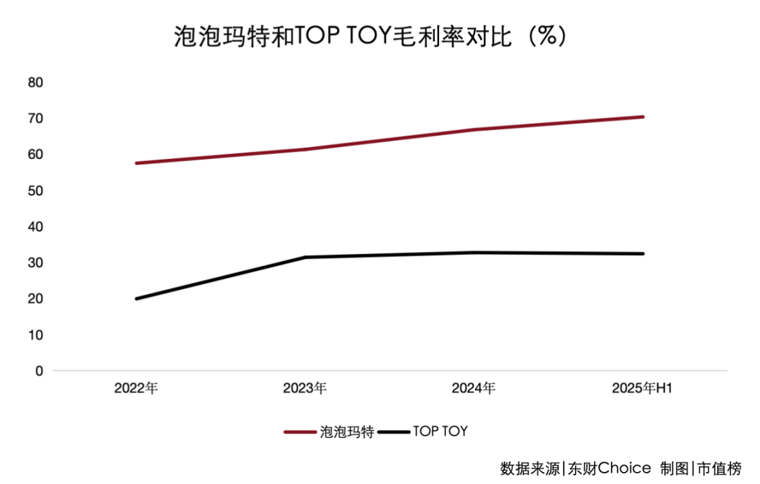 2025年上半年,泡泡瑪特的毛利率高達(dá)70.3%,遠(yuǎn)高于TOP TOY的32.4%。