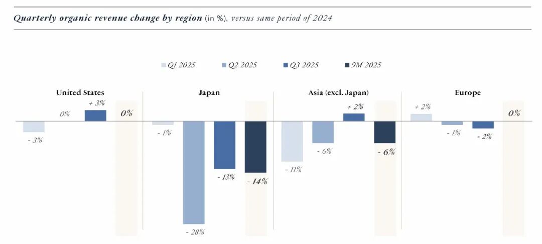 LVMH集團(tuán)第三季度同比變化是:中國(guó)大陸銷售額增長(zhǎng)7%,美國(guó)銷售額增長(zhǎng)3%,歐洲下降了2%。