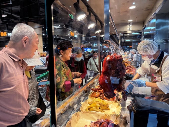 熟食區(qū)推出甜腸、麻辣牛肉條、香辣/五香豬蹄、壽司、椒鹽皮皮蝦、羅氏蝦、椒鹽蹄膀等豐富品類,同時引入本地特色商品蕪湖紅皮鴨、鹵鵝、烤豬頭肉,強(qiáng)化區(qū)域消費(fèi)黏性。