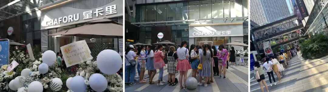 回顧品牌發(fā)展歷程,2019年7月1日,CHAFORU星卡里首家門(mén)店正式登陸重慶時(shí)代天街D館,首日銷(xiāo)量就突破600杯,排隊(duì)的人潮長(zhǎng)達(dá)數(shù)百米。盡管當(dāng)時(shí)氣溫高達(dá)38℃,但依然有眾多粉絲在高溫下打著傘、舉著王俊凱的應(yīng)援燈牌排隊(duì)打卡,甚至還有不少?gòu)耐獾刳s來(lái)的粉絲,拖著行李箱加入排隊(duì)長(zhǎng)龍,這樣的盛況后來(lái)被粉絲稱(chēng)作 “追星界的打卡神話”。