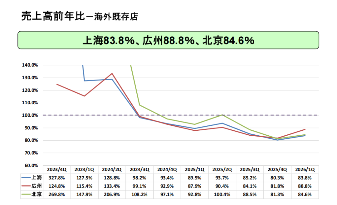 但在中國市場,一些讓人擔憂的信號也正在顯現(xiàn)出來,薩莉亞的盈利能力正在承壓:2025財年,薩莉亞同店銷售持續(xù)疲軟,北上廣門店的營業(yè)利潤普遍下滑超20%。