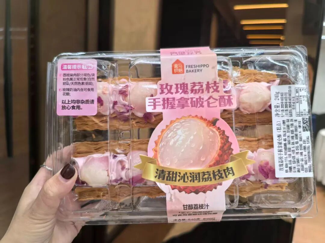 “我個人非常喜歡今年盒馬報送的‘玫瑰荔枝手握拿破侖酥’。首先,它加入了鮮甜的荔枝;其次,在保鮮技術上應用了HPP低溫鎖鮮技術,這說明盒馬將飲料、烘焙和水果三個領域的創(chuàng)新融合在了一起?诟猩,荔枝的鮮甜、奶油的絲滑以及拿破侖分層后的酥脆感,共同為喜愛拿破侖的消費者帶來了完美的體驗。”