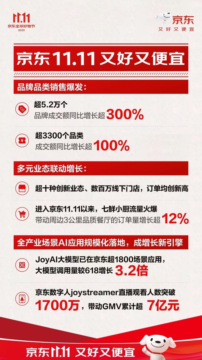 這個(gè)京東 11.11,AI 技術(shù)全面滲透經(jīng)營(yíng)各環(huán)節(jié),助力品牌和商家降本提效。京東云攜 JoyAI 系列產(chǎn)品服務(wù)超 300 萬(wàn)商家;JoyAI大模型已在京東超1800場(chǎng)景應(yīng)用,大模型調(diào)用量(token)較618增長(zhǎng)了3.2倍;JoyBuilder模型開(kāi)發(fā)平臺(tái),調(diào)用量較去年同期增長(zhǎng)超6倍;京東數(shù)字人JoyStreamer服務(wù)品牌超35000家,截至目前,數(shù)字人直播觀看人數(shù)突破1700萬(wàn),帶動(dòng)GMV 累計(jì)超 7 億元。AI 重構(gòu)消費(fèi)體驗(yàn),兼顧 “高效率 + 高情商”的京東智能客服累計(jì)咨詢服務(wù)量超13億,覆蓋了售前、售中、售后、物流等全場(chǎng)景,用戶滿意度80%以上。京東金融以白條分期免息、支付補(bǔ)貼、供應(yīng)鏈金融商家息費(fèi)優(yōu)惠、保險(xiǎn)服務(wù)等多種形式“百億消費(fèi)補(bǔ)貼”助力銷售增長(zhǎng)。