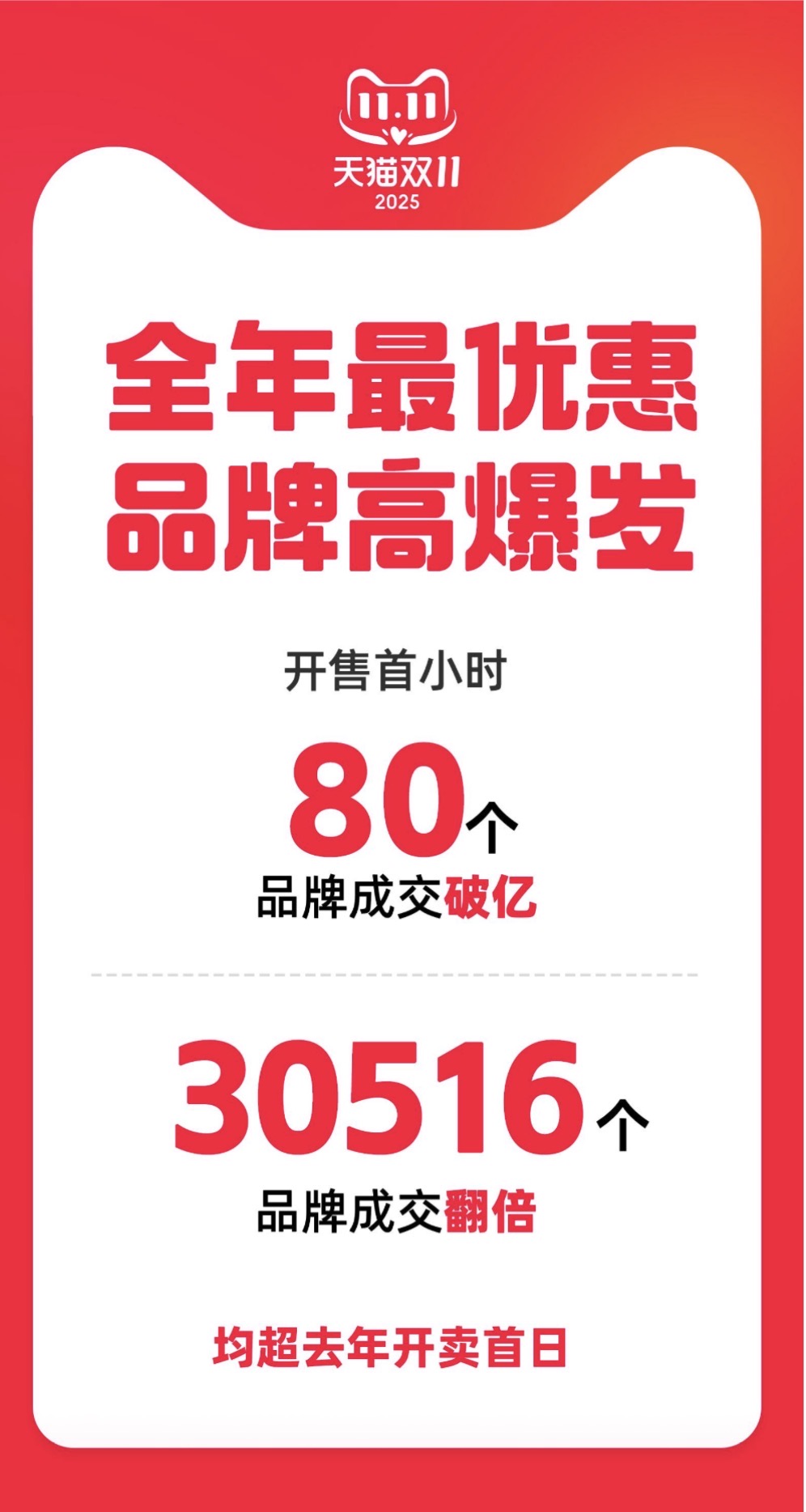 10月20日晚8點,2025天貓雙11正式開賣,品牌爆發(fā)速度更快,增長更猛。開賣首小時,蘋果、源氏木語、珀萊雅、修麗可、斐樂、雅詩蘭黛、蘭蔻、歐萊雅、海藍之謎、石頭、耐克、lululemon等80個品牌成交破億,30516個品牌成交翻倍,均超去年開賣首日,18919個品牌首小時成交即超去年全天。