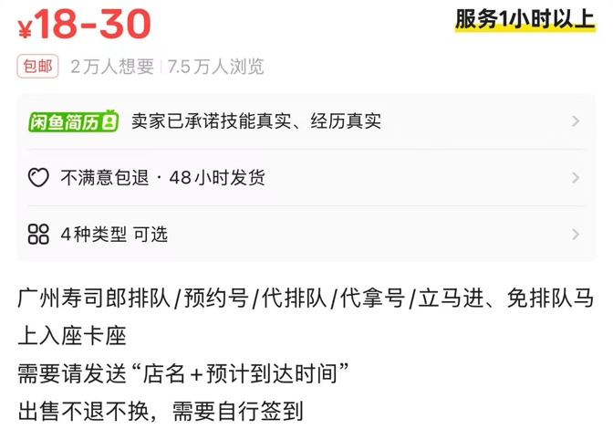 壽司郎愈發(fā)火爆的情況下,排隊(duì)需求自然催生出了黃牛的生意,在一些平臺上,有賣家推出壽司郎“代排隊(duì)”“免排隊(duì)”的生意,售價為數(shù)十元。