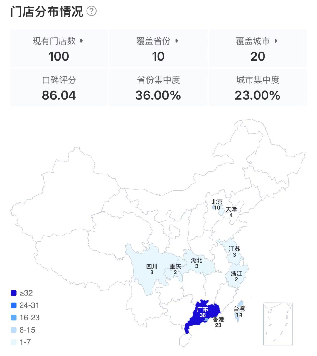 可能也是基于上述原因,即便爆火如壽司郎,其目前在中國開店的速度依然較為緩慢。從2021年至今,其也僅開設(shè)100家門店,在各個開店城市的門店密度也并不大。