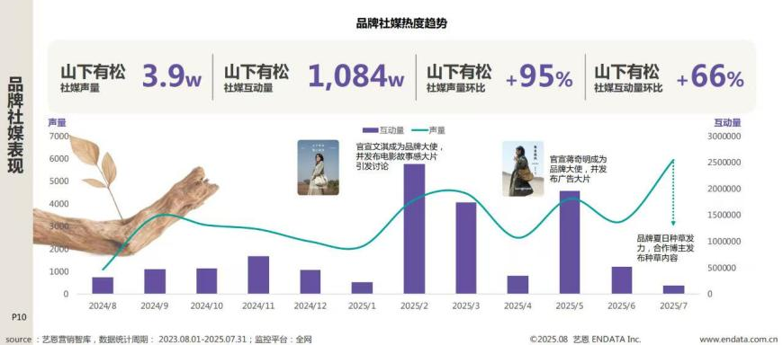藝恩數(shù)據(jù)顯示,2025年山下有松的社媒聲量通過代言故事和短片實現(xiàn)了破圈式發(fā)展,同時,山下有松的社媒投放金額也同比增長28%