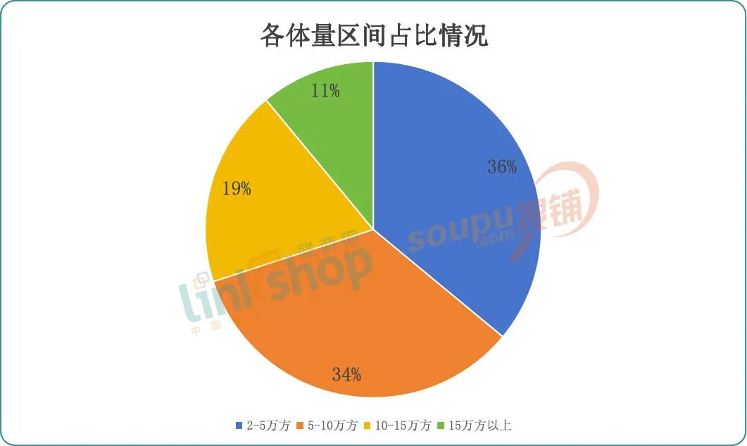 5-10萬㎡的中型項(xiàng)目占比達(dá)34%,也是目前市場新開購物中心最主流的產(chǎn)品線。