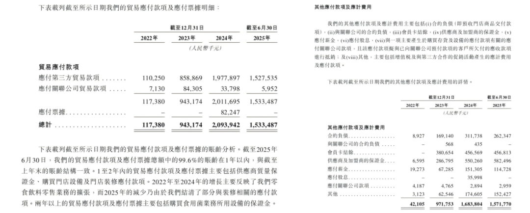 一般情況下,貿(mào)易商付款可被視作對供應(yīng)商的應(yīng)付、未付款項;其他應(yīng)付款項則來自對加盟商的預(yù)收貨款、會員卡結(jié)余及加盟保證金等。以此計算,萬辰集團對供應(yīng)商的“欠款”負債占總負債的29.9%;對下游加盟商的“押款”導(dǎo)致的負債則為30.7%。