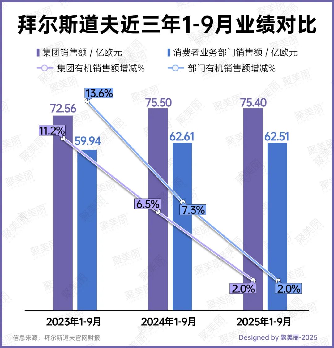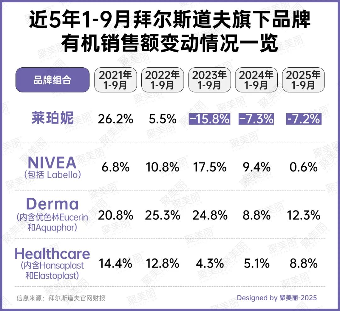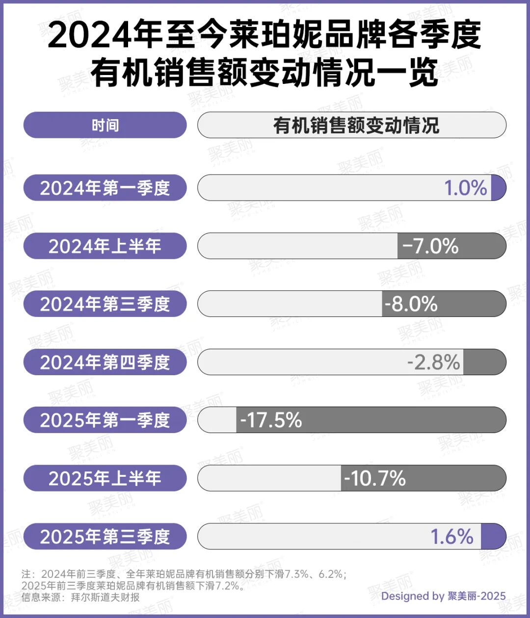 10月23日,萊珀妮母公司拜爾斯道夫發(fā)布了2025年三季報(bào),在2025年前9個(gè)月的銷(xiāo)售表現(xiàn)中,萊珀妮下滑7.2%,在今年Q1和上半年該品牌銷(xiāo)售額也均呈下滑態(tài)勢(shì)。
