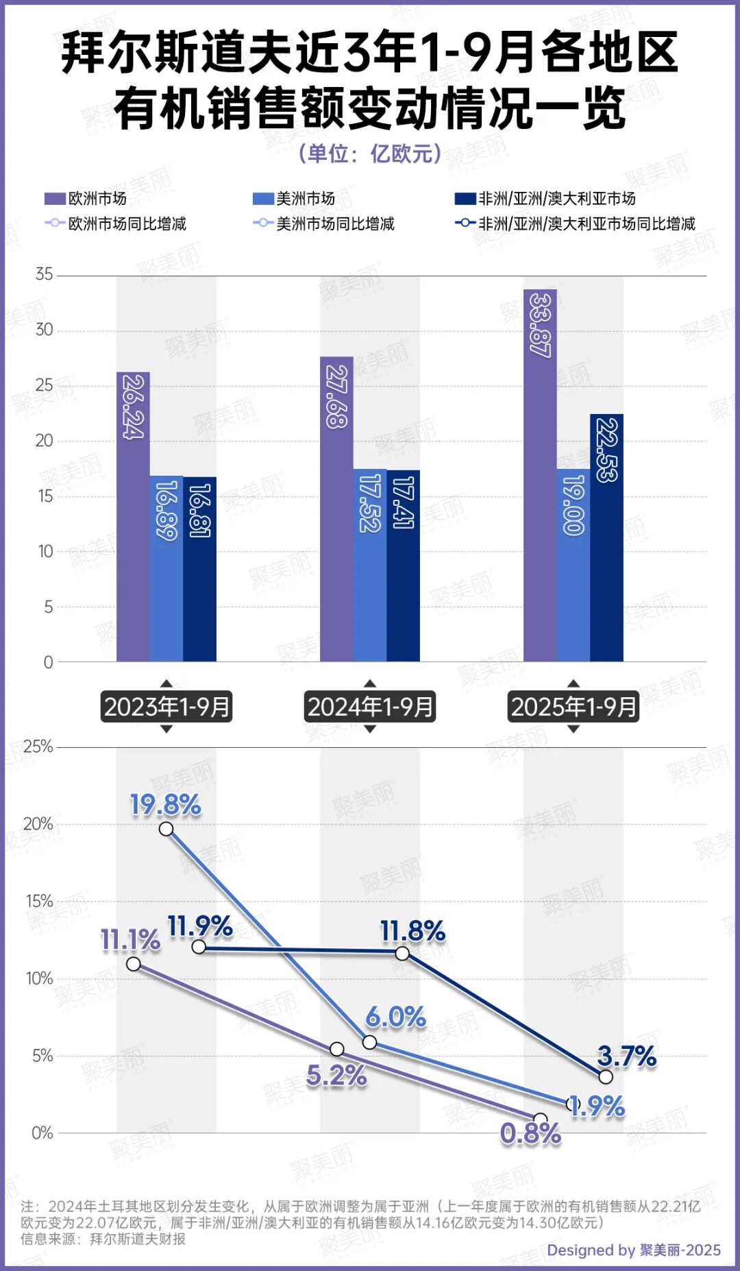其中,作為拜爾斯道夫第一大市場(chǎng)的歐洲市場(chǎng),在2025年1-9月有機(jī)微增0.8%;營(yíng)收占比最少的美洲市場(chǎng)有機(jī)增長(zhǎng)1.9%;包括中國(guó)市場(chǎng)在內(nèi)的非洲/亞洲/澳大利亞市場(chǎng)有機(jī)銷(xiāo)售額為22.53億歐元(約合人民幣186.07億元),增長(zhǎng)3.7%,已連續(xù)2年同期成為三大市場(chǎng)中增速最快地區(qū)。