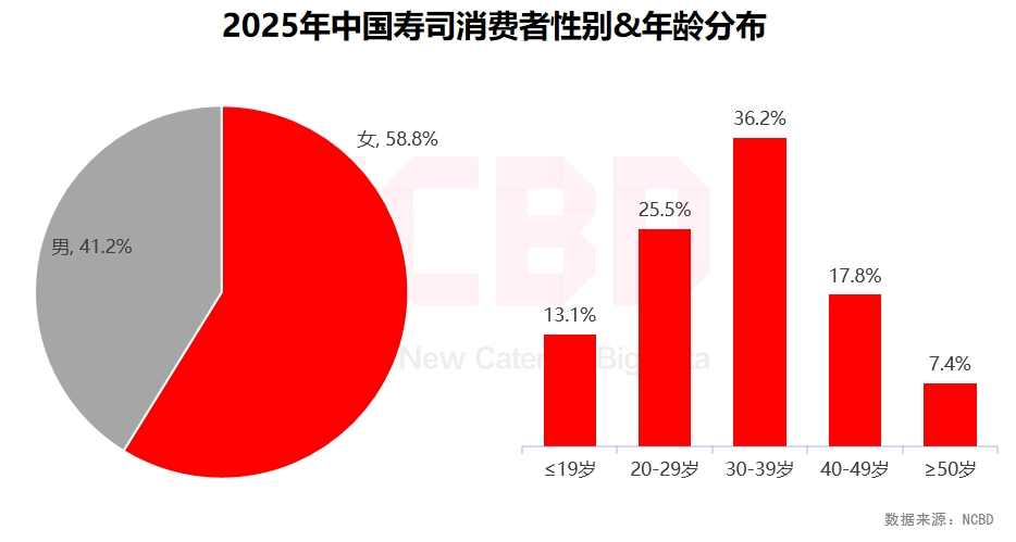 比如在門店設(shè)計(jì)上。NCBD(餐寶典)的《中國壽司品類發(fā)展研究報(bào)告》顯示,30歲以下消費(fèi)者占壽司消費(fèi)群體的38.6%,加上30-39歲群體的36.2%,年輕消費(fèi)者成為絕對主力。女性消費(fèi)者占比接近60%,她們對壽司的顏值、口感細(xì)膩度和社交分享價(jià)值有著更高要求。