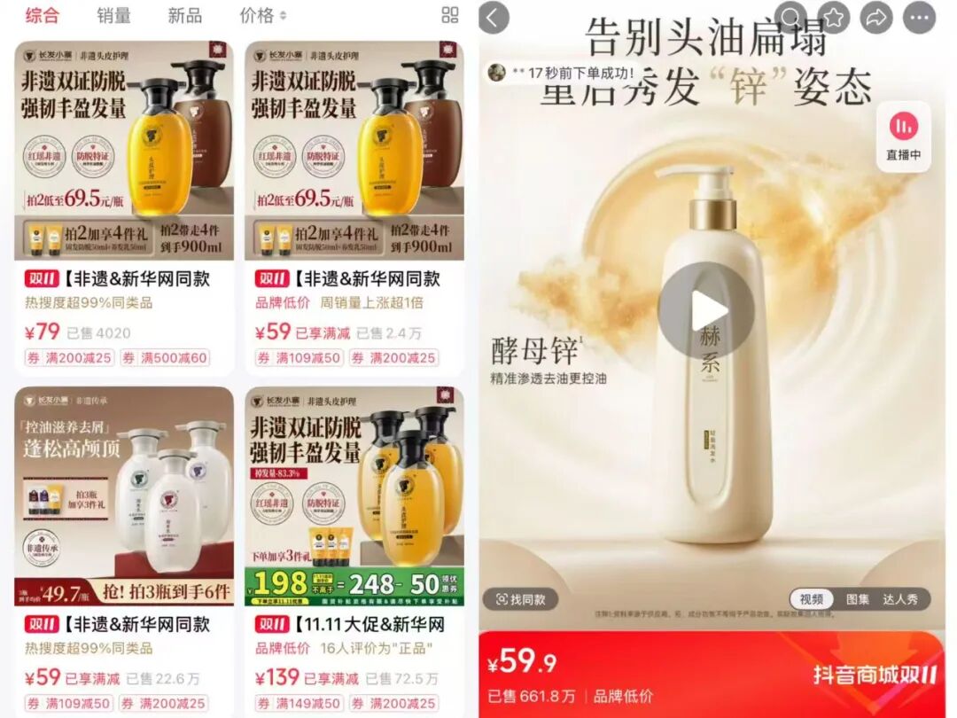 除了赫系之外,長(zhǎng)發(fā)小寨勢(shì)能也在持續(xù)拔高,三季度更是沖進(jìn)TOP1。據(jù)悉,長(zhǎng)發(fā)小寨創(chuàng)立于2018年,理念源自廣西龍勝各族自治縣紅瑤長(zhǎng)發(fā)村的淘米水護(hù)發(fā)傳統(tǒng)。長(zhǎng)發(fā)小寨自2021年進(jìn)駐抖音,2024年起月GMV穩(wěn)定在千萬(wàn)級(jí),次年7月沖進(jìn)5000W+且持續(xù)保持該體量。其大爆品為防脫輕盈精華液和淘米水洗發(fā)水,季度GMV均千萬(wàn)級(jí)。目前,長(zhǎng)發(fā)小寨三季度超八成GMV由直播貢獻(xiàn),帶貨上品牌自營(yíng)與達(dá)人推廣并行,新華社、新華網(wǎng)及東方甄選是其主要捆綁的三大賬號(hào)。