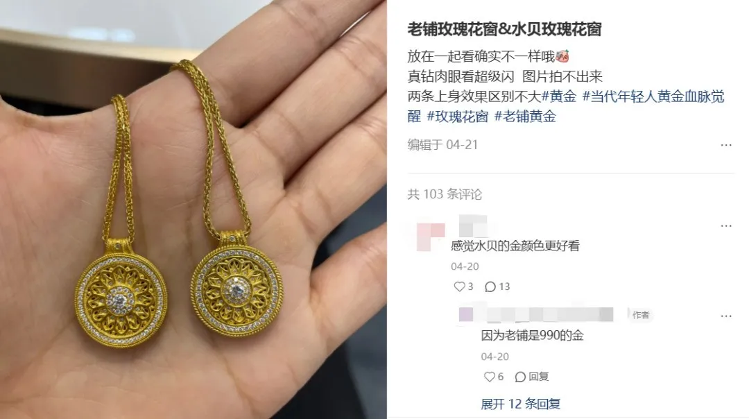 有網(wǎng)友對(duì)比發(fā)現(xiàn),水貝復(fù)刻老鋪黃金的復(fù)雜款式與原版尚有差距,但普通款式已經(jīng)能做到完全還原。很多喜歡古法工藝又不執(zhí)著品牌服務(wù)的網(wǎng)友,都會(huì)直接買水貝貨。