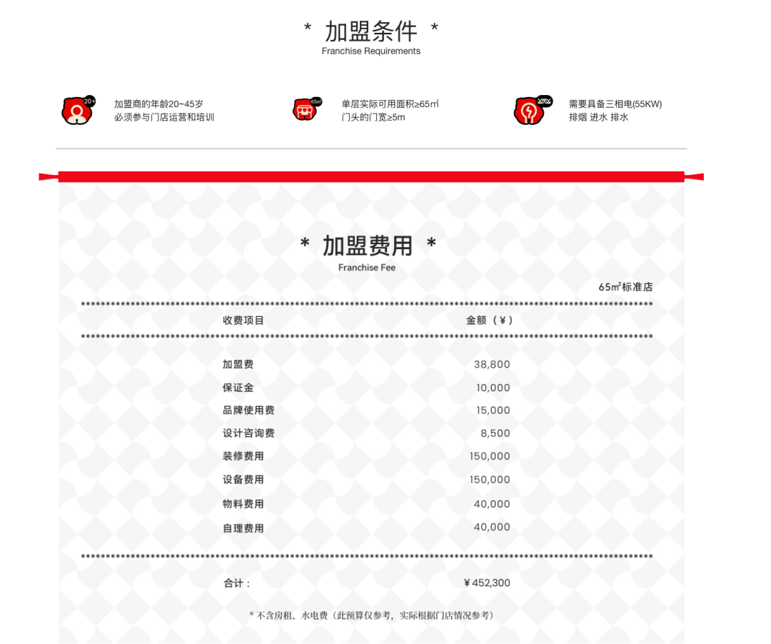 塔斯汀官網(wǎng)顯示,包括目前加盟一家門(mén)店的投資費(fèi)用為45.23萬(wàn)元,其中包括加盟費(fèi)、保證金、品牌使用費(fèi)、裝修費(fèi)和設(shè)計(jì)費(fèi)等。