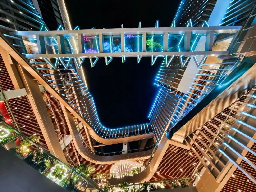 梅州天虹購物中心總體量達10萬平方米,建筑設計以體驗為導向,從空間動線到功能布局均以顧客需求為核心定制。地下一層與地上五層的雙首層設計,搭配1200個智慧停車位,構建起高效便捷的交通網絡。