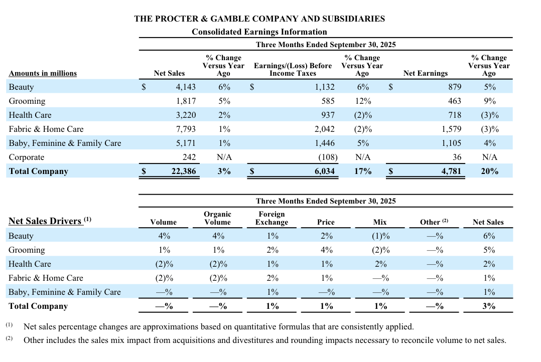 近期,寶潔公布2026財(cái)年第一季度(2025年7月-9月)財(cái)報(bào),期內(nèi)凈銷售額達(dá)到224億美元(約合人民幣1592.82億元),同比上漲3%;不含外匯、收購(gòu)及資產(chǎn)剝離影響后的有機(jī)銷售額增長(zhǎng)了2%;凈收益達(dá)到47.81億美元(約合人民幣339.97億元),同比上漲20%。