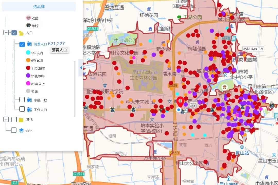 城西商圈屬于昆山向西發(fā)展的新城區(qū),住宅品質(zhì)、城市界面、交通情況較好,項(xiàng)目車程10分鐘范圍內(nèi)住宅更集中于項(xiàng)目東側(cè);而從上圖的住房房齡可以看出,西側(cè)住宅房齡相對較新,且仍有潛在人口導(dǎo)入空間。