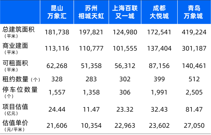 從具體規(guī)模、估值單價(jià)來看,昆山萬象匯與蘇州相城天虹、上海百聯(lián)又一城及成都大悅城三者有更強(qiáng)可對比性。同時(shí)我們也增加了同一基金的青島萬象城項(xiàng)目作為參考觀察。后續(xù)分析,也會(huì)結(jié)合這些項(xiàng)目進(jìn)行對比。