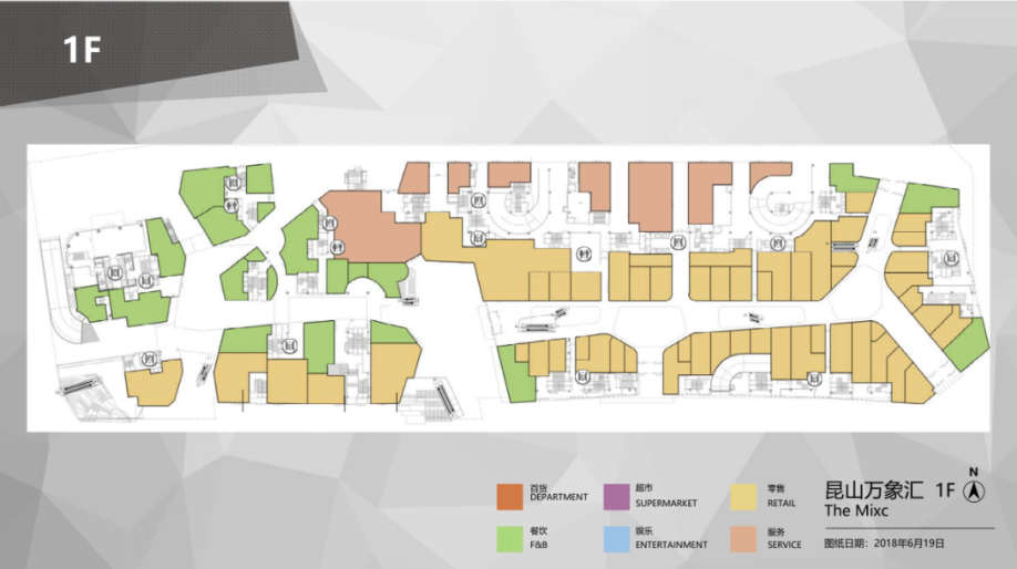 得鋪率與百聯(lián)又一城相當(dāng)55%,一字型動(dòng)線、簡潔明了,較為標(biāo)準(zhǔn)的萬象匯產(chǎn)品。