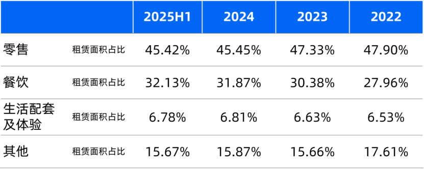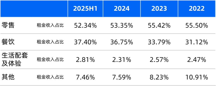 其余業(yè)態(tài)中,零售面積及租金占比保持穩(wěn)定,餐飲收入貢獻(xiàn)的提升明顯、近四年已增長4%,領(lǐng)先于其面積增長速度,背后體現(xiàn)出其餐飲品牌調(diào)整的成功,也符合盡兩年餐飲品牌熱度不斷的趨向。