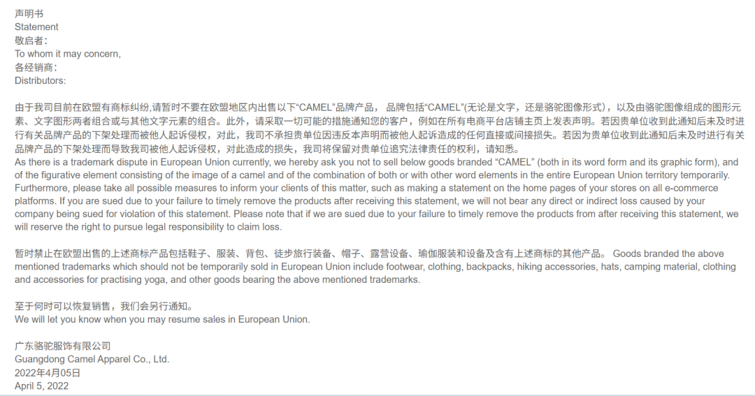官網(wǎng)顯示,駱駝至今在歐盟地區(qū)仍面臨商標(biāo)糾紛,這一問題持續(xù)對(duì)品牌的全球化擴(kuò)張步伐形成掣肘。