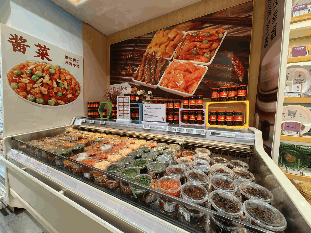 蛋品和榨菜也有專柜陳列,體現(xiàn)出了極強的品項組合能力。