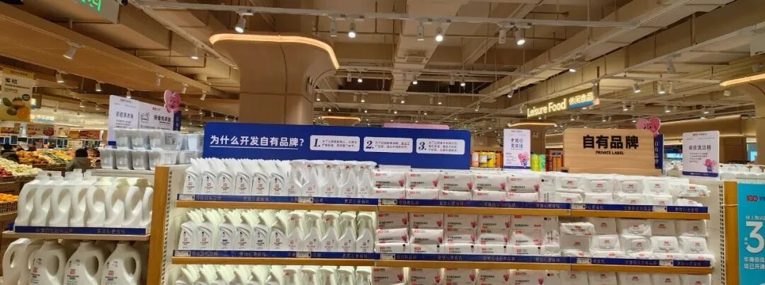 在日化區(qū),自有品牌的紙巾、洗衣液等放大陳列在片區(qū)最外沿,由于風格統(tǒng)一且設(shè)計簡潔,非常有利于品牌的調(diào)性表達。