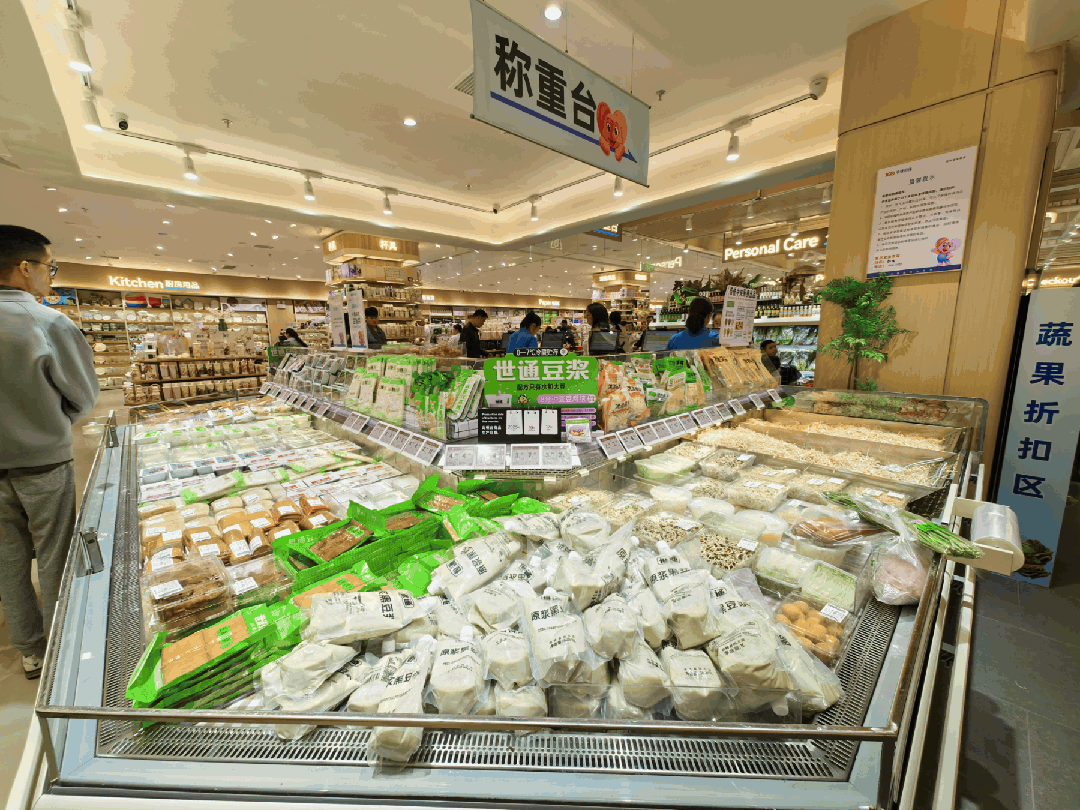 在蔬果稱重處,來自華豫佰佳中央廚房的豆制品,品種豐富、營造了安全放心的品質(zhì)銷售氛圍。