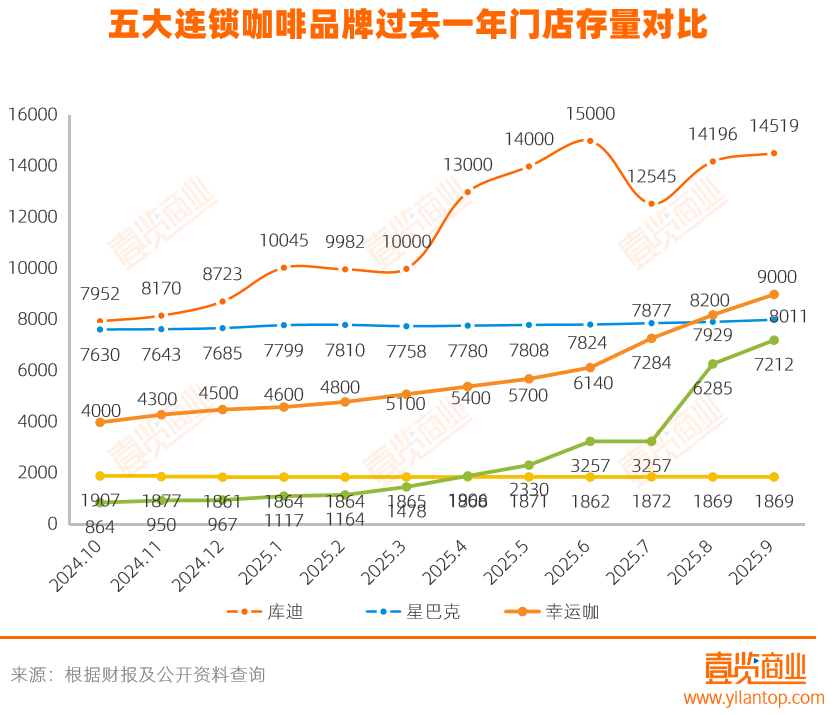 從個體動態(tài)看,部分品牌的拓店節(jié)奏出現(xiàn)明顯變化。星巴克在本月新增159家門店,環(huán)比增長205.77%,顯示出其重啟積極擴張的策略;庫迪咖啡則在9月新開563家門店,相比8月減少943家,降幅達62.61%,增速明顯放緩;而幸運咖9月新增600家,相較前兩個月上千家的規(guī)模,節(jié)奏略有收斂。