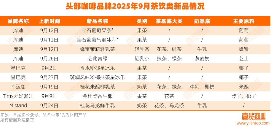 值得一提的是,咖啡品牌也在加速布局茶飲領域。據茶咖觀察統(tǒng)計,9月,門店數量排名前十的咖啡品牌共上新9款茶飲類產品,其中庫迪推出4款,占其9月新品總數的80.0%;星巴克上新2款星冰樂;幸運咖、Tims天好咖啡與M stand各推出1款茶飲新品。