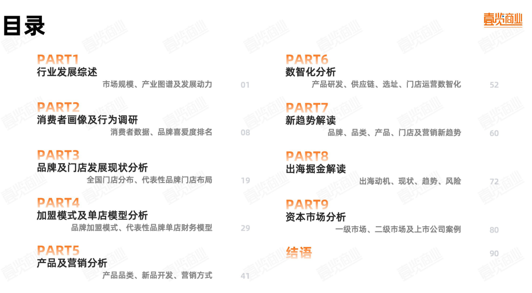 《報(bào)告》總體分為八個(gè)部分,分別從行業(yè)、消費(fèi)者、品牌及門(mén)店、加盟、產(chǎn)品、營(yíng)銷、數(shù)字化、資本市場(chǎng)及2025新趨勢(shì)等10個(gè)方向全面解讀2025現(xiàn)制茶飲行業(yè)。