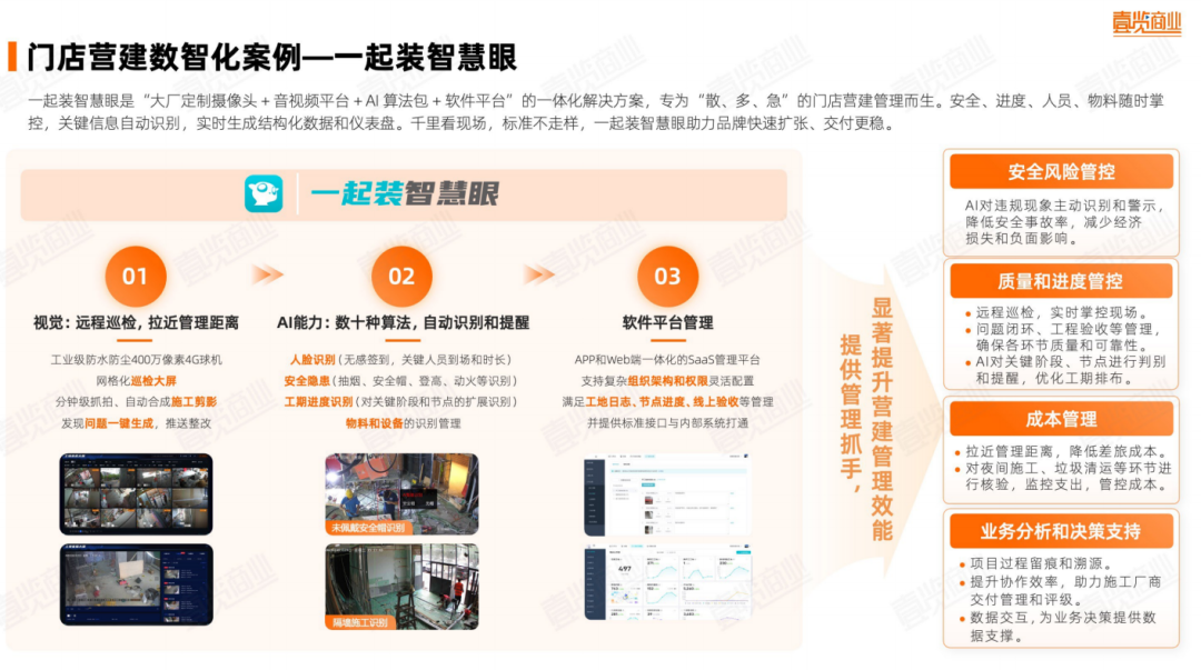 這一體系讓品牌實(shí)現(xiàn)了從“人盯現(xiàn)場(chǎng)”到“AI盯工地”的跨越:AI可通過(guò)算法完成自動(dòng)巡檢、階段對(duì)比和節(jié)點(diǎn)驗(yàn)收,幫助品牌實(shí)現(xiàn)項(xiàng)目管理的可量化、可追蹤,顯著提升門(mén)店擴(kuò)張效率。