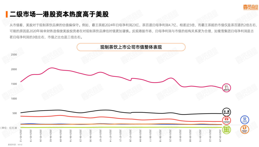 港股成為現(xiàn)制茶飲品牌上市的主要陣地,資本關(guān)注度明顯高于美股。無(wú)論是從市值體量還是盈利結(jié)構(gòu)來(lái)看,蜜雪冰城已獨(dú)立成檔,其市值和營(yíng)收均遠(yuǎn)超其他品牌;古茗與霸王茶姬形成第二梯隊(duì),具備穩(wěn)定增長(zhǎng)與盈利能力;茶百道、滬上阿姨、奈雪的茶則位于第三梯隊(duì),市值分化明顯。