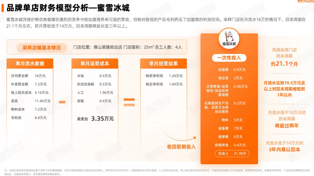 而蜜雪冰城,憑借價(jià)格優(yōu)勢(shì)能夠在激烈的競(jìng)爭(zhēng)中給加盟商帶來(lái)可觀的營(yíng)收,但相對(duì)較低的產(chǎn)品毛利擠壓了加盟商的利潤(rùn)空間。采樣門(mén)店在月流水16萬(wàn)的情況下,回本周期在21.1個(gè)月左右,若月?tīng)I(yíng)收低于14萬(wàn)元,回本周期將延長(zhǎng)至三年以上。