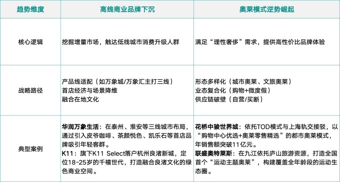 消費(fèi)市場的二元分化在2025年愈發(fā)明顯。一方面,一線城市和新一線城市市場趨于飽和,競爭白熱化;另一方面,低線城市(三四線城市)的消費(fèi)升級需求正在釋放。對應(yīng)的高線商業(yè)品牌如萬象城、K11、香港置地系商業(yè)等品牌下沉二三線市場,同時(shí)奧萊商業(yè)也在快速崛起。