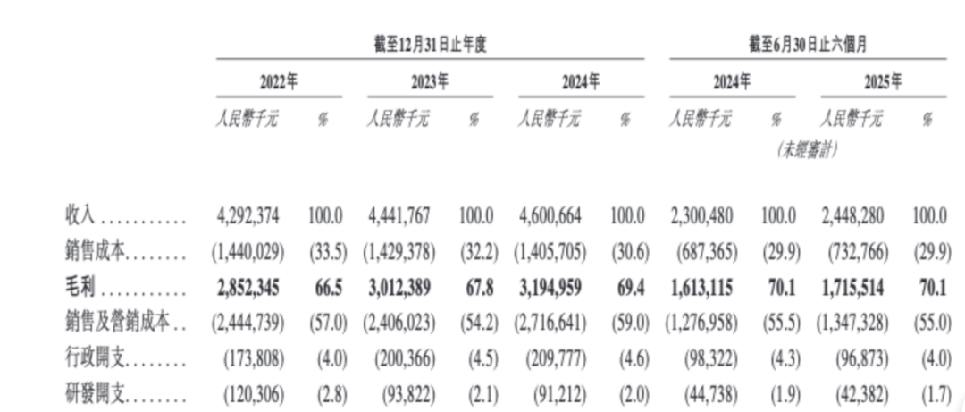 根據(jù)招股書(shū),2022-2024年,自然堂的銷售及營(yíng)銷成本占其全年收入的比例分別約為57%、54.2%以及59%。同期,研發(fā)費(fèi)用率則是2.8%、2.1%、2.0%,呈現(xiàn)一個(gè)走低的趨勢(shì)。