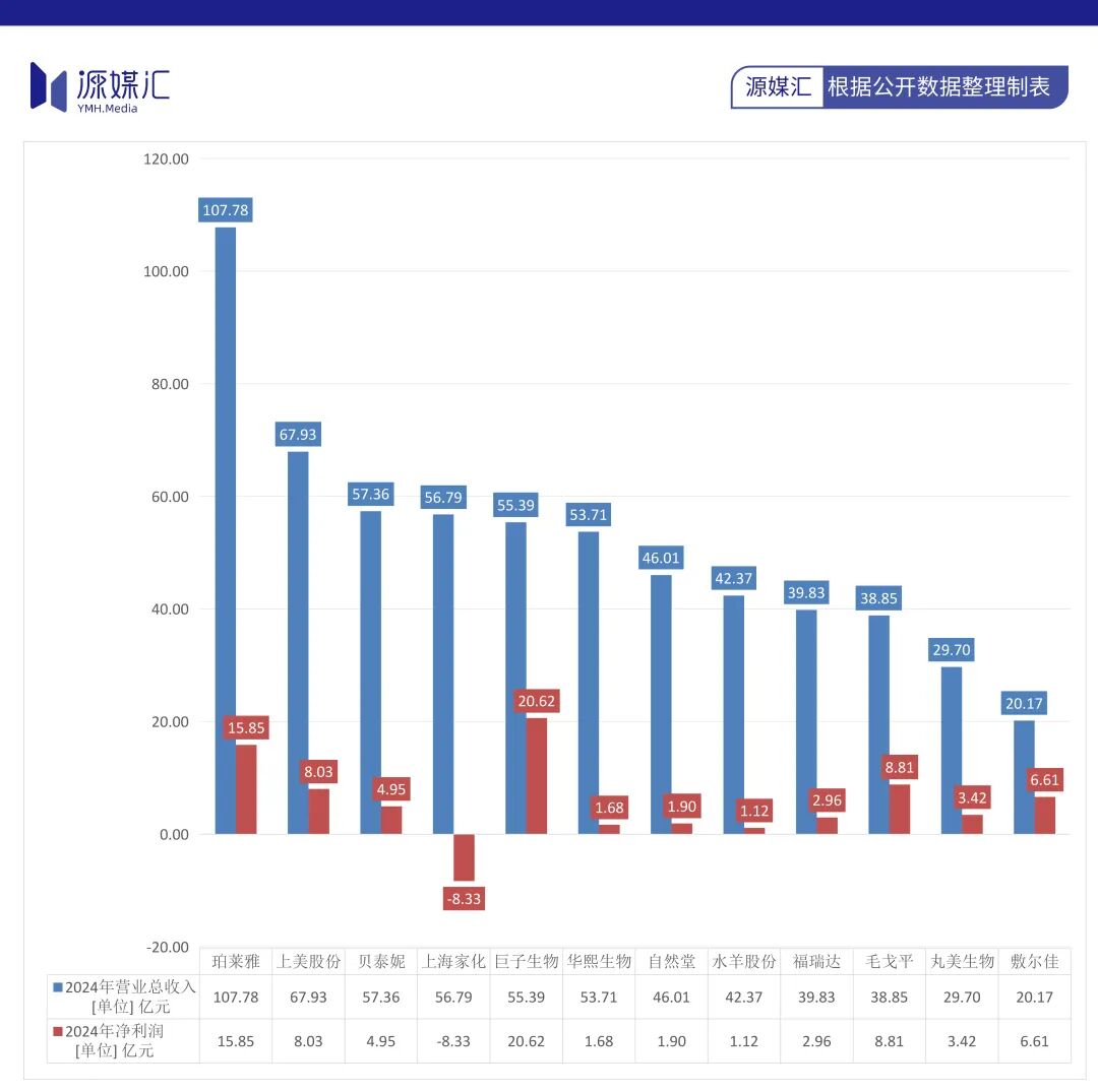 從營(yíng)業(yè)收入上來(lái)看,2024年珀萊雅率先進(jìn)入“百億俱樂(lè)部”,上美股份緊跟其后,其次是貝泰妮、上海家化、巨子生物以及華熙生物,自然堂的營(yíng)收在2024年上市美妝企業(yè)中排在第7位,凈利潤(rùn)排在第9位。
