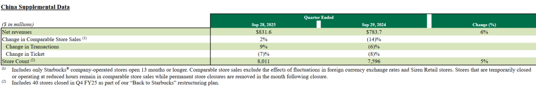 單看第四季度(截至2025年9月28日),星巴克中國的營收達(dá)到8.316億美元(約合人民幣59.29億元),同比增長6%;同店銷售額同比增長2%,同店交易量同比增長9%。