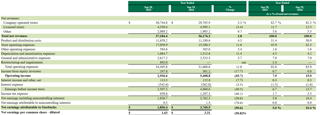 2025財年第四季度,星巴克的營業(yè)利潤率降至2.9%,而去年同期為14.4%。