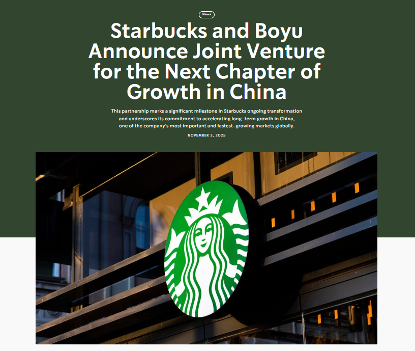 11月4日早間消息,星巴克咖啡公司宣布與博裕投資(Boyu Capital)達(dá)成戰(zhàn)略合作,雙方將成立合資企業(yè),共同運營星巴克在中國市場的零售業(yè)務(wù)。