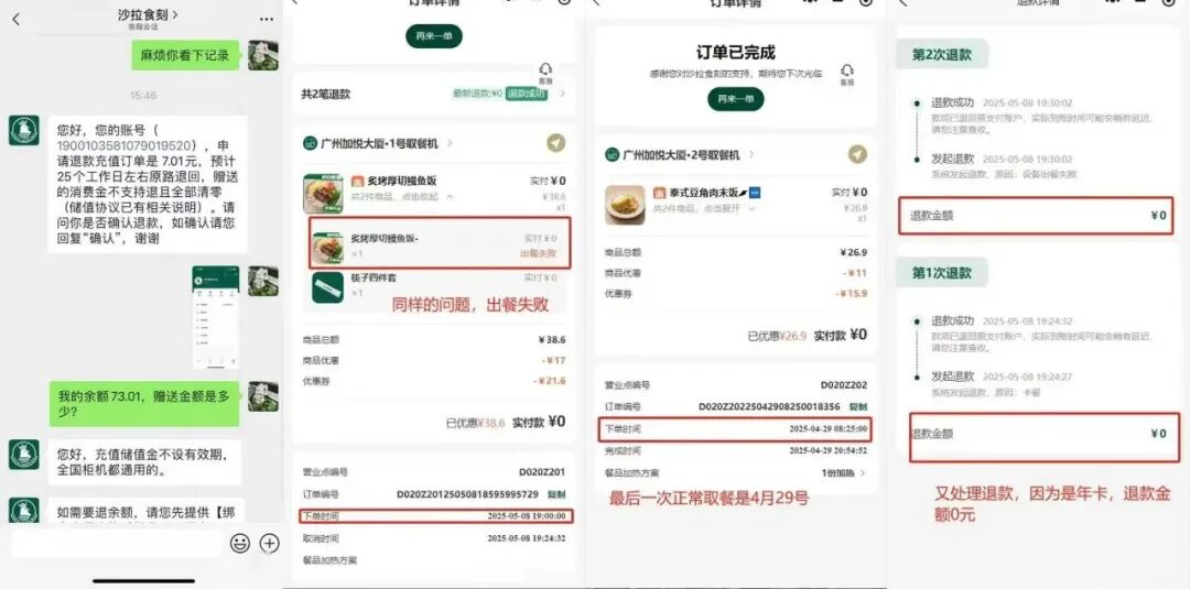 有多位用戶(hù)反映,賬戶(hù)中還有幾百塊余額,柜機(jī)撤了,至今都退不了款;另有消費(fèi)者在年初購(gòu)買(mǎi)2025年“工作日免單”年卡后,常去的3家門(mén)店自5月起長(zhǎng)期處于“打烊”狀態(tài),無(wú)法履約。餐柜長(zhǎng)期“售罄”、客服響應(yīng)遲緩等問(wèn)題頻發(fā),消費(fèi)體驗(yàn)持續(xù)惡化。